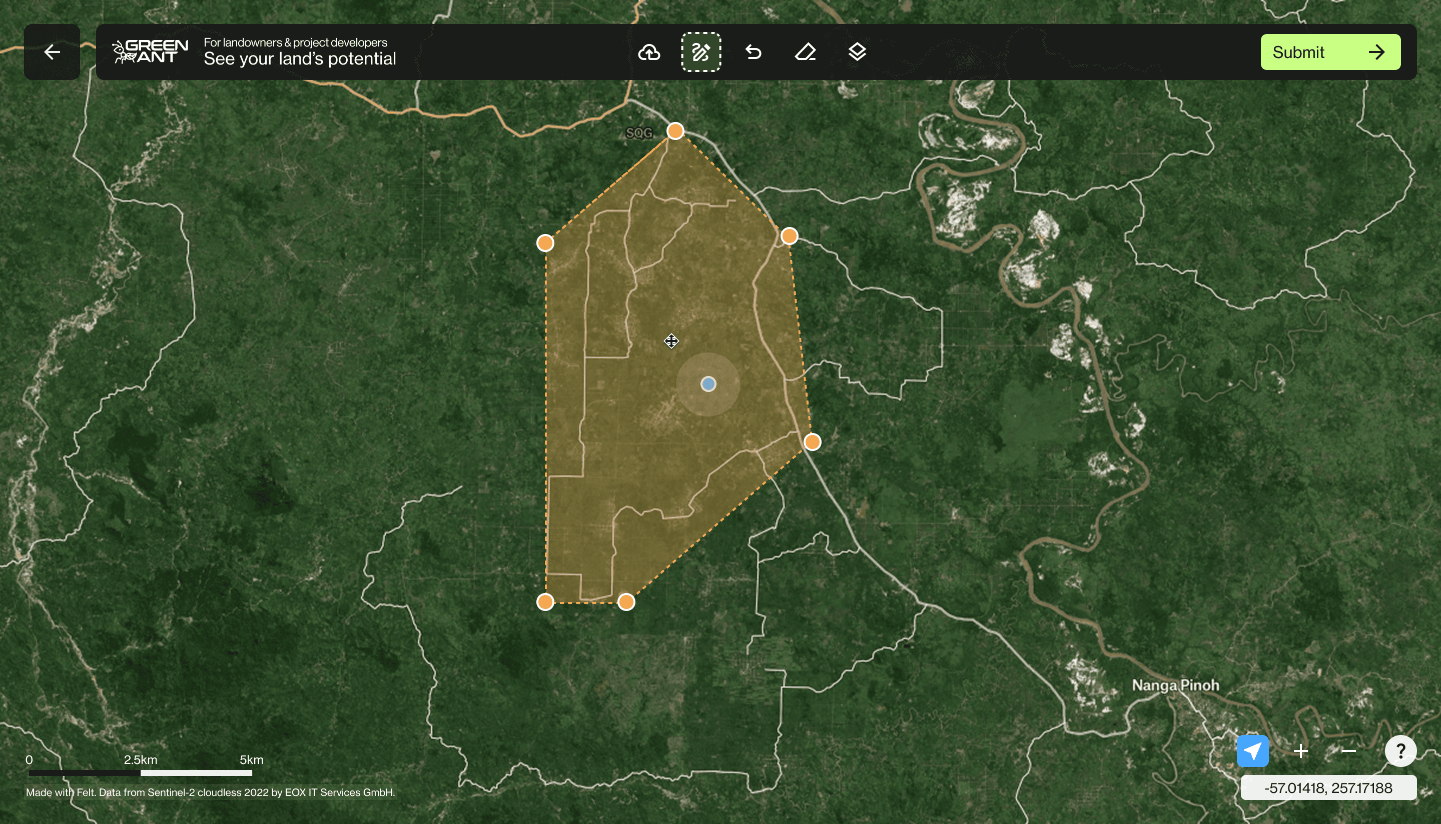 To bridge the precision-accessibility gap, I designed a geospatial interface that prioritises visual mapping over precise data entry. This allows landowners to visually define their "Area of Interest" (AOI) directly on satellite imagery with relative ease, facilitating an intuitive starting point for the complex carbon-estimation methodology.